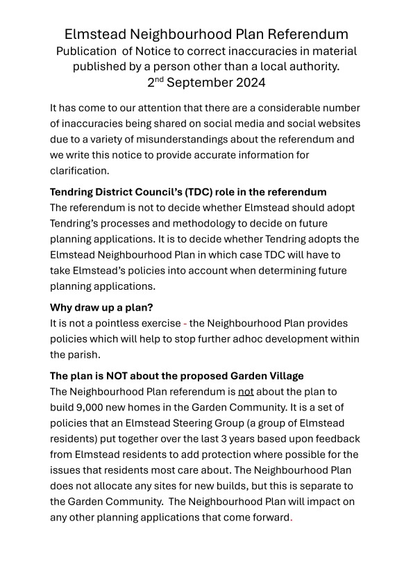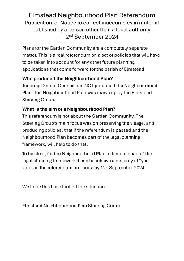 Elmstead Neighbourhood Plan Referendum - Correction of Inaccuracies